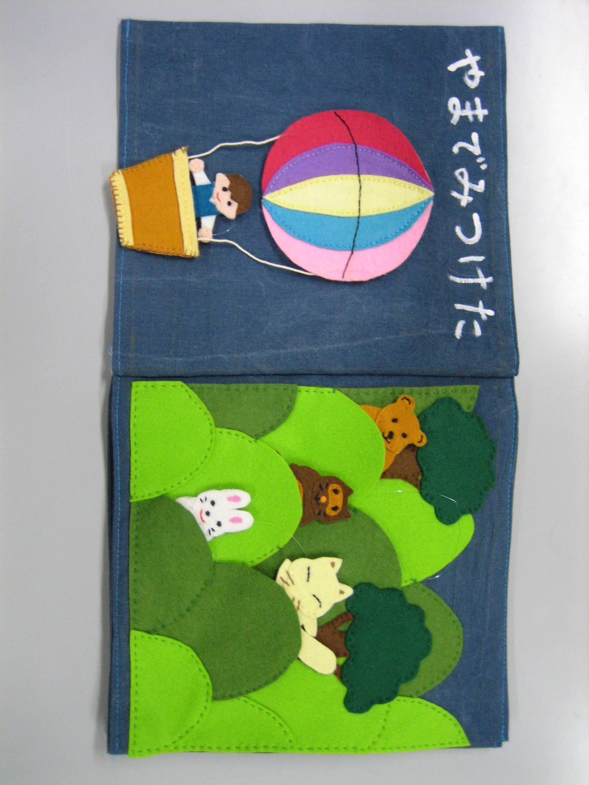 子どもたち用に工夫して作られた絵本です。フェルトのアップリケやマジックテープのついた絵本を作っています。さらに、絵本の一部を触ったり、動かしたりして楽しんでいただけるようにしてあります。